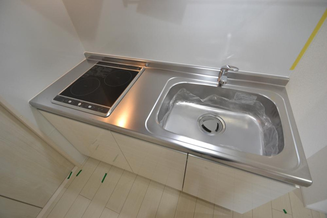 続いて、キッチンのご紹介になります。コンロはIH2口のコンロになっており、調理スペースもしっかり確保されています。フジパレスシリーズのキッチンは、使いやすさと機能性を重視した設計が魅力です。まず、システムキッチンが多くの物件で採用されており、調理スペースと収納が効率よく配置されているため、料理のしやすさが抜群です。調理台は広めに設けられていることが多く、まな板や食材を置いても余裕があり、日々の料理がスムーズに進みます。また、2口のIHクッキングヒーターやガスコンロが設置されている物件が多く、火力が安定しているうえに同時調理も可能。自炊派にはうれしいポイントです。IHの場合は火を使わないため、火災のリスクが低く、安全性にも優れています。さらに、キッチン下の収納スペースも充実しており、鍋やフライパン、調味料などをしっかり整理整頓できます。見た目もすっきりとしたデザインが多く、清潔感があります。中にはカウンターキッチンタイプの間取りもあり、リビングとの一体感がありながら、会話を楽しみながら調理ができるなど、生活の質を高めてくれます。フジパレスのキッチンは、日々の料理が楽しくなるような設計がされており、シンプルながらも実用性に優れた設備が整っています。これにより、一人暮らしから二人暮らしまで幅広いライフスタイルに対応した快適な住空間を実現しています。