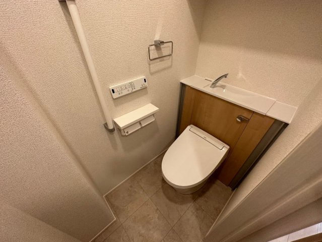 続いてはトイレのご紹介です。トイレはウォシュレット付きになっております。ウォシュレット付きのトイレの良いところは、快適さと清潔さを大幅に向上させる点にあります。まず、快適さが一番の魅力です。ウォシュレットの温水洗浄機能により、トイレ後の「拭く」という作業を水で洗い流すことができるため、紙で拭く時の不快感を減少させます。また、温水が肌に優しく、寒い季節でも温かい水で洗浄できるので、冷たいトイレの不快感を感じることなく、リラックスして用を足すことができます。特にお年寄りや身体の不自由な方にとっては、非常に便利で優しい機能と言えます。次に、清潔さです。ウォシュレットは水で洗い流すため、トイレットペーパーで拭くことによる摩擦や皮膚への負担を軽減します。これにより、デリケートな部分を優しくケアでき、衛生面でも安心です。また、ウォシュレットの一部には「脱臭機能」や「除菌機能」がついているモデルもあり、トイレ内の臭いを抑えることができ、常に清潔な環境を保つことができます。さらに、経済的な面もあります。ウォシュレットは紙の使用を減らすため、長期的にはトイレットペーパーの消費を抑えることができ、環境にも配慮した選択です。特に家庭で複数人が使う場合、消耗品の節約にもつながります。ウォシュレット付きのトイレは、日々のトイレ使用を快適で清潔に保ち、心地よい生活空間を提供してくれる優れた設備です。