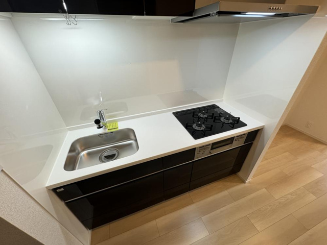続いて、キッチンのご紹介になります。コンロはガス3口のシステムキッチンになっております。システムキッチンの良いところは、使いやすさとデザイン性を兼ね備えている点です。調理台や収納、シンク、コンロなどが一体化されているため、作業の動線がスムーズで効率的に調理ができます。また、収納スペースが豊富で、調理器具や食材を整理しやすく、キッチンがすっきり片付きます。掃除もしやすい設計で、ステンレスや人造大理石など汚れがつきにくい素材が使われていることが多いのもポイントです。そしてグリル付きなところもいいですね。ガス3口でグリル付きのキッチンには、多くの利点があります。まず、3つのバーナーが同時に使えるため、複数の料理を効率よく調理でき、時間の節約につながります。例えば、メイン料理を一つのバーナーで調理しながら、副菜やスープを他のバーナーで同時に作ることが可能です。これにより、忙しい時間帯でもスムーズに調理が進みます。さらに、グリルが付いていることで、魚や肉、野菜をヘルシーに焼き上げることができます。グリル調理は油を使わずに焼くため、カロリーを抑えた料理が作れ、健康志向の方にもおすすめです。また、グリルは焼き加減を細かく調整できる機種も多く、料理の幅が広がります。いろんなお料理ができるので毎日が楽しみですね。またガスコンロは火力調整が瞬時にできるため、炒め物や煮込み料理など火加減が重要な調理にも最適です。電気やIHコンロと比べて、火の見える安心感もあります。特に料理好きの方や本格的な調理を好む方にはぴったりです。