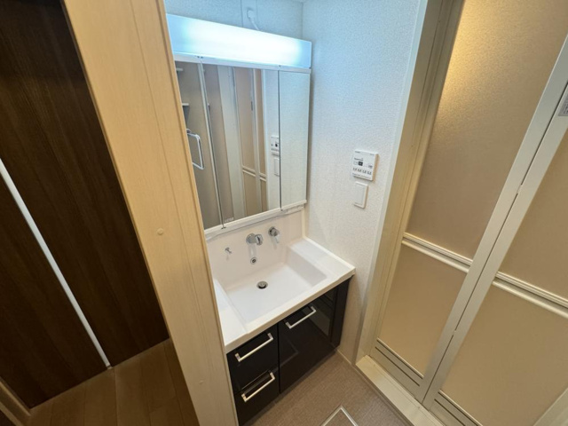 続いては独立洗面台です。「パルク大西」の独立洗面台の良いところは、身支度がスムーズにできます。浴室とは別空間にあるので、朝の準備や着替え時にも便利。入浴やトイレ使用中でも気兼ねなく手洗いや歯磨きができ、生活動線が快適です。広めの鏡と明るいライトが備わり、洗顔だけでなくメイクやヘアセットもはかどります。特に女性や身だしなみに気を遣う方にうれしい設備です 。また、ドライヤーやヘアアイロンなど、電源を必要とする家電が安心して使えます。浴室内にないので感電の心配がなく、安全・快適にヘアセットが可能です。そしてキャビネット下や鏡裏収納があり、タオルや洗顔料、化粧品、ドライヤーなどをすっきり整理できます。水気に弱い物も安心して収納でき、空間が汚れにくいのもポイントです。さらにバスルームと分離されているため、湯気による鏡の曇りやカビの発生が抑えられ、いつも清潔な状態で使えるのが魅力です。