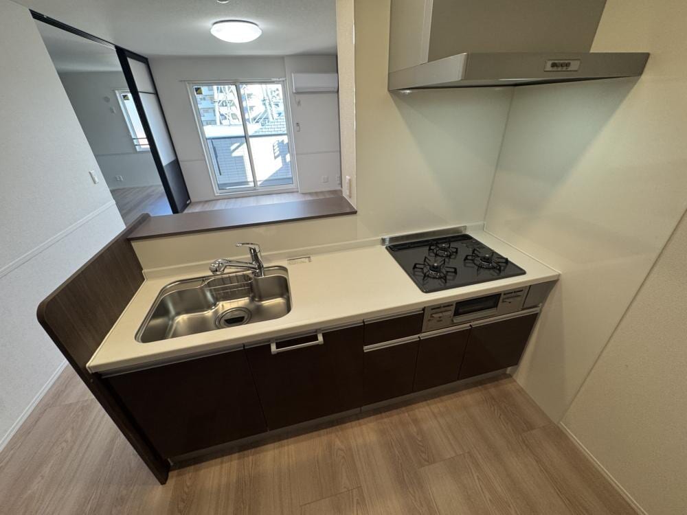 続きまして、アグレアーブル立花の水廻りは、暮らしの快適さと機能性をしっかりと両立した設計が魅力です。キッチン、浴室、洗面所、トイレといった生活の基盤を支える空間が、単に“設備が揃っている”というだけでなく、「使いたくなる」「手をかけたくなる」場所として整えられていることが、この住戸の大きな特徴だといえるでしょう。 キッチンは、調理のしやすさと空間全体との調和が考えられたつくりになっています。システムキッチンが採用されており、見た目の美しさはもちろん、機能面でも日々の料理をスムーズにしてくれる設計です。2〜3口のガスコンロが設置されており、同時調理が可能なので、朝の忙しい時間帯や夕食準備時にも効率よく作業を進めることができます。ガスコンロならではの火力の調整もしやすく、煮物や炒め物など料理の幅も広がります。さらに、調理スペースやシンクも程よい広さが確保されており、まな板を置いての作業や、洗い物も窮屈さを感じることなく行えるでしょう。換気設備も整っており、調理中の煙や匂いが室内にこもりにくく、快適な空間を保つことができます。キッチンの配置も、リビングやダイニングとのつながりを持たせるような開放的な設計になっていて、家族や来客との会話を楽しみながら料理ができることも、暮らしの中の心地よさを支えてくれる要素のひとつです。 続いて、浴室も大きな魅力のひとつです。この部屋には追焚き機能が備わっており、帰宅時間がずれた家族でも温かいお風呂に入り直すことができます。一度沸かしたお湯を再加熱できるこの機能は、特に寒い季節や、ゆっくり湯船に浸かりたい時に重宝されます。浴槽や壁面、床の素材にも清掃のしやすさが考慮されており、日々の手入れを負担に感じにくいのも魅力です。湿気のこもりにくい換気システムも備わっているため、カビの発生を抑えやすく、清潔な状態を保ちやすい浴室空間が整っています。浴室そのものはシンプルで無駄がなく、落ち着いたトーンの内装が、日々の疲れを癒やすリラックススペースとしての役割をきちんと果たしてくれます。 洗面所は、独立洗面台が設置されており、朝の支度や帰宅後の手洗い・うがいなどの動線がスムーズに行えるように配慮されています。洗面ボウルの広さや鏡の大きさも日常使いには十分で、ちょっとした化粧品や洗面用具を置ける収納スペースも備わっています。洗濯機置き場が室内に確保されていることも、天候に左右されずに洗濯作業ができるという点で非常に実用的です。脱衣所としても機能するこの洗面スペースは、浴室とトイレとの距離感も程よく、生活の流れを自然につなげてくれる構造になっています。 トイレは、清潔感のある独立型で、空間自体に窮屈さを感じさせない広さがあります。温水洗浄便座の機能が備わっており、冬場でも快適に使用できる仕様です。手洗い付きタンクや収納スペースの工夫によって、日用品の管理もスムーズに行うことができ、日々の生活における小さなストレスが丁寧に取り除かれています。 このように、706号室の水廻りは、それぞれが単独で機能的であるだけでなく、住戸全体の動線や生活リズムをしっかりと意識して配置されているのがポイントです。料理をする、入浴する、洗顔をする、トイレを使う――こうした日常のあらゆる行為を“作業”としてではなく、“習慣の中の心地よい一コマ”として成立させてくれる、そんな暮らしの背景としての水廻りが、この部屋にはあります。清潔感、使いやすさ、そして日々に寄り添う機能性。それらが見事に整った706号室の水廻りは、住む人の生活を静かに、しかし確実に支えてくれる頼れる存在だといえるでしょう。
